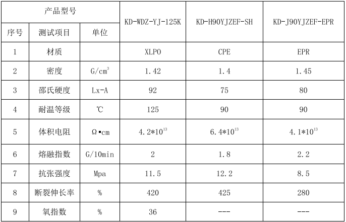 核电缆及风能电缆基本物性表