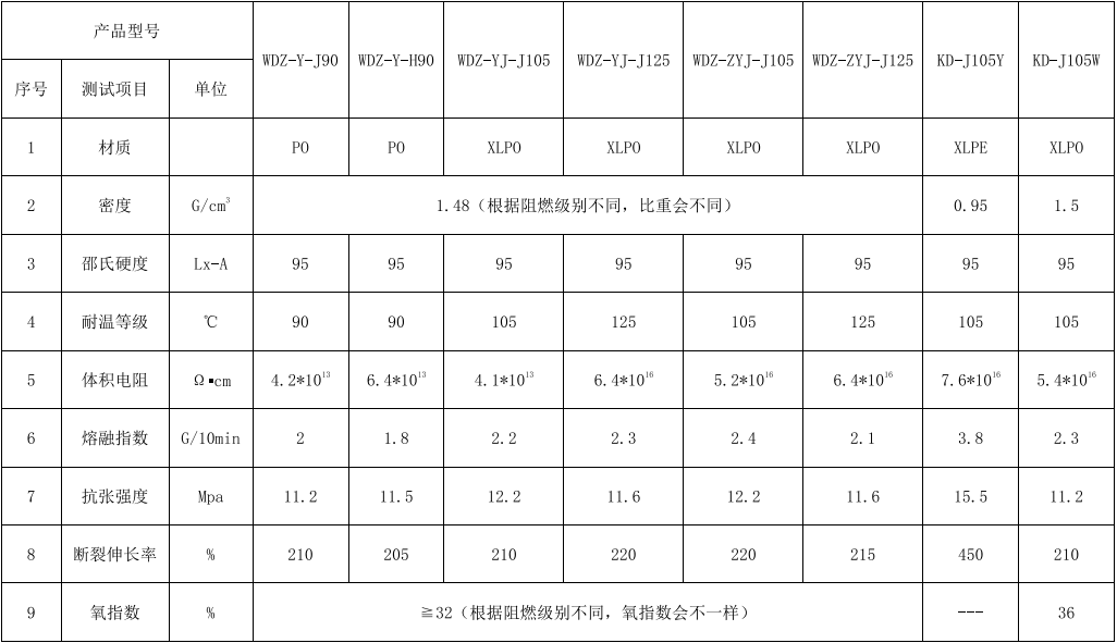 低烟无卤建筑线缆材料典型物性表